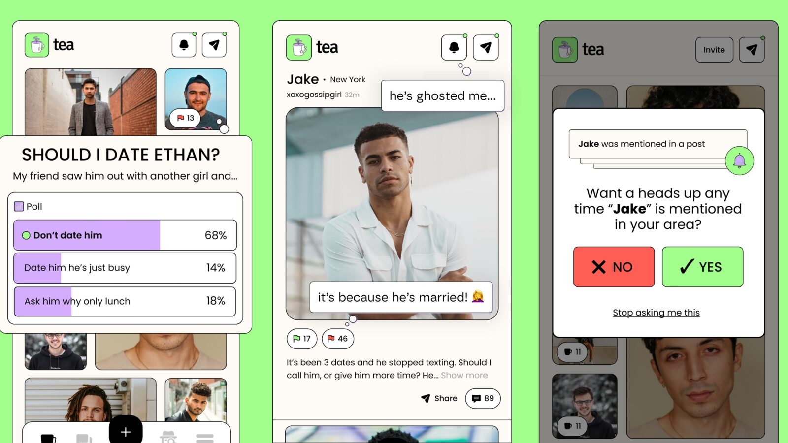 Batizado de Tea, o aplicativo serve como uma comunidade de apoio para mulheres saberem mais sobre determinados homens. É possível alertar sobre comportamentos problemáticos e indicar se acham que outras deveriam sair com eles.
