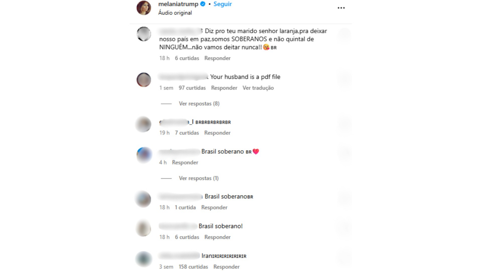 Brasileiros buscam perfis no Instagram ligados a Trump para criticarem taxação. ‘Diz pro teu marido, o Senhor Laranja, pra deixar nosso país em paz, somos soberanos’, diz brasileiro a primeira-dama. Brasileiros ‘invadem’ perfil de Trump e dominam comentários