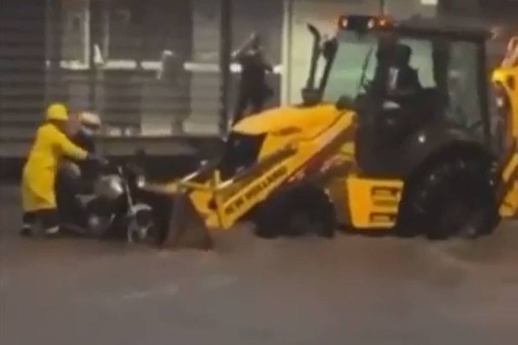 Ele foi auxiliado por trabalhadores de uma empresa próxima, que utilizaram a retroescavadeira para tirar o homem e a moto do local. A região é ponto frequente de alagamento quando fortes chuvas atingem a cidade.