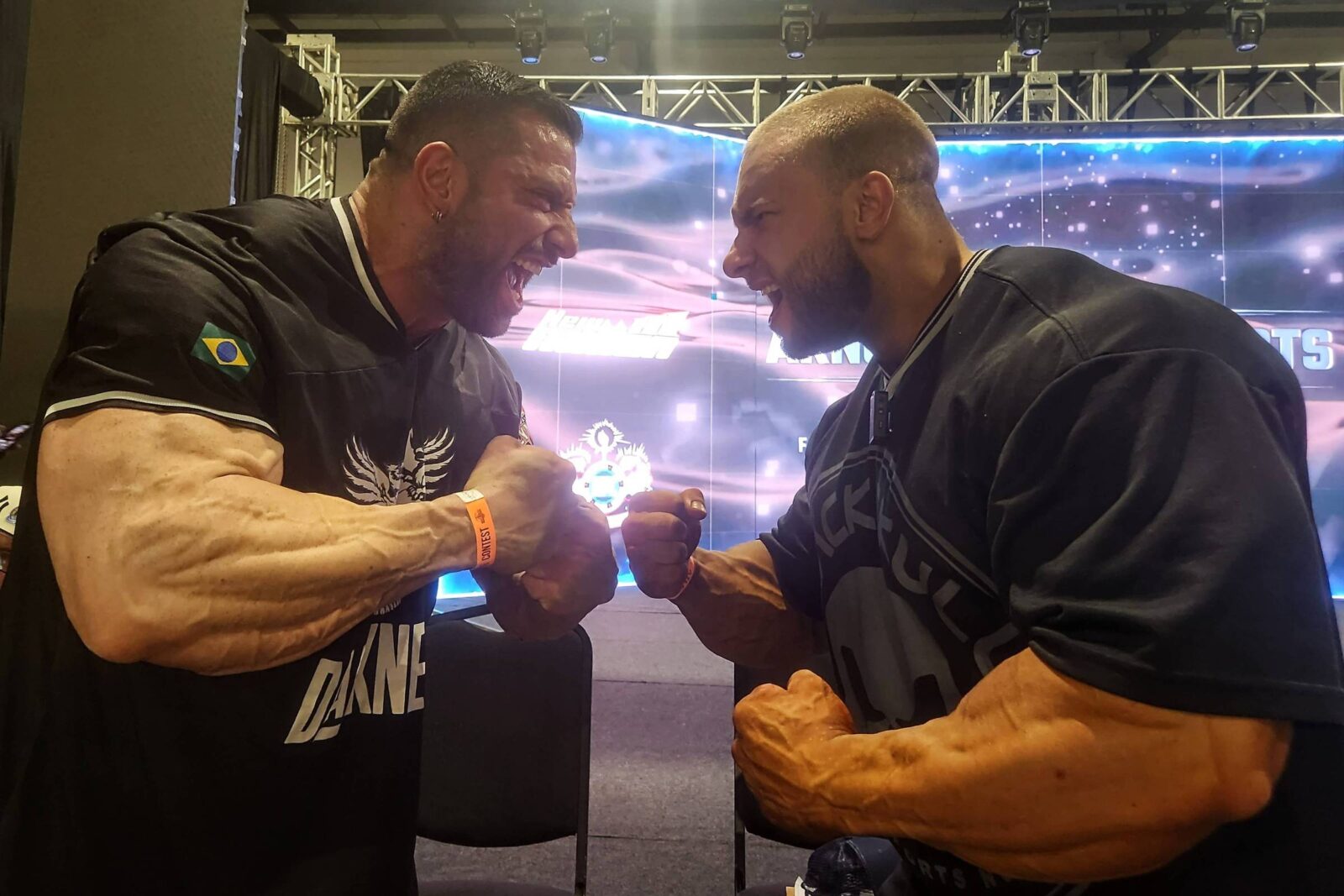“Depois de ficar aproximadamente um ano e meio sem competir, coloquei 10kg de palco e estarei ainda mais seco”, aponta o brasileiro. “Ano passado, eu estava pesando 110kg há dois dias da minha competição. Hoje, no mesmo período da preparação, estou com 115kg”, rebate o russo.