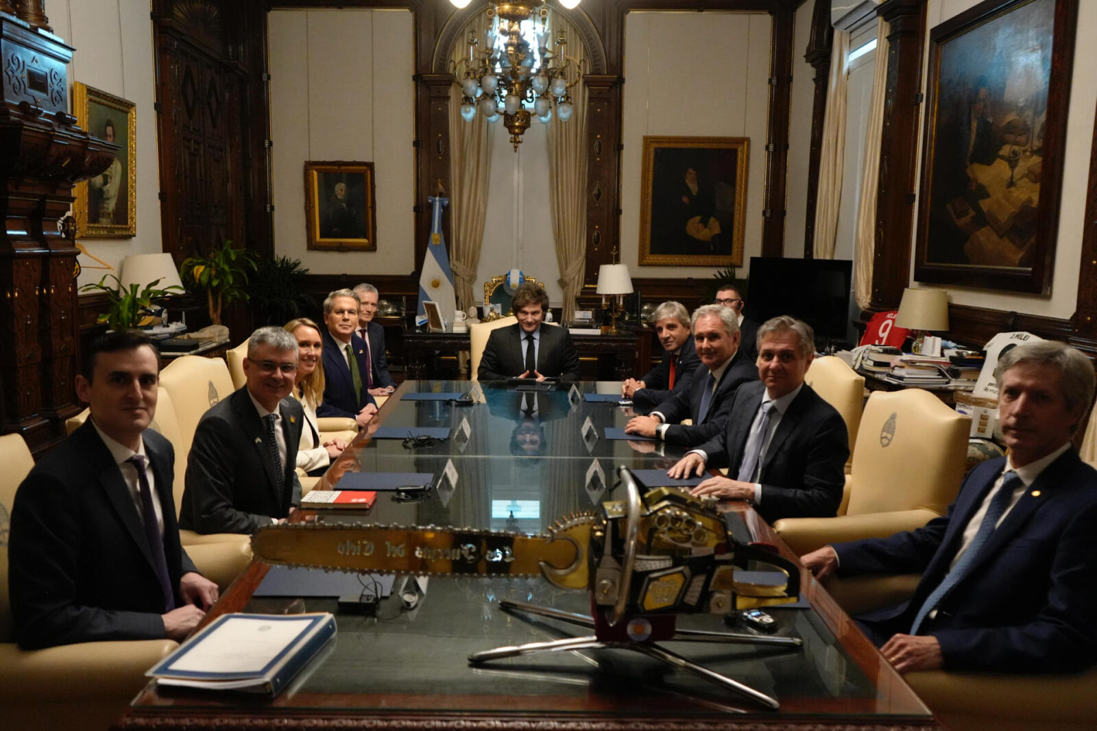 Foto divulgada pela Presidência da Argentina mostra o presidente Javier Milei (ao centro) reunido com o secretário do Tesouro dos EUA, Scott Bessent (quarto à esquerda), nesta segunda-feira (14), na Casa Rosada, em Buenos Aires. (Foto: EFE/ Presidencia de Argentina)